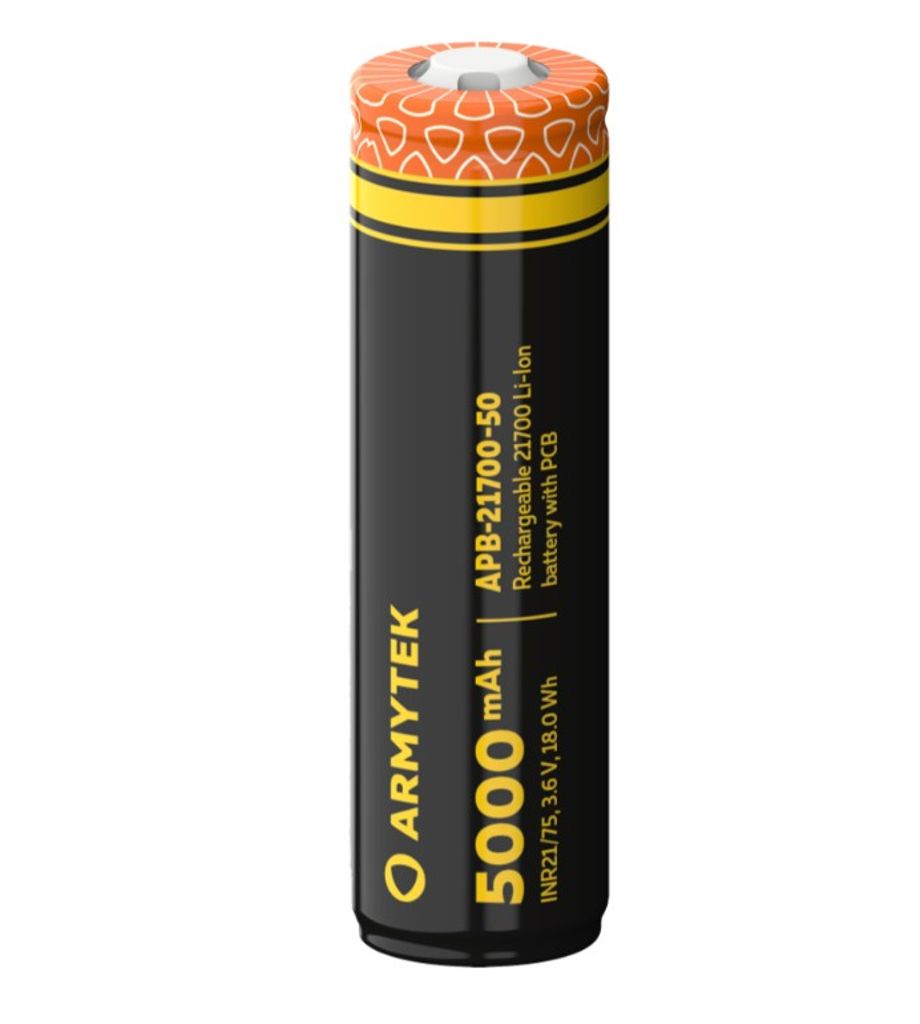 Armytek 21700 Li-ion er et kraftfuldt og pålideligt genopladeligt batteri, udviklet til at imødekomme høje krav til både ydeevne og udholdenhed. Med en kapacitet på 5000 mAh giver batteriet lang driftstid og er ideelt til lommelygter, pandelamper og andet energikrævende udstyr.